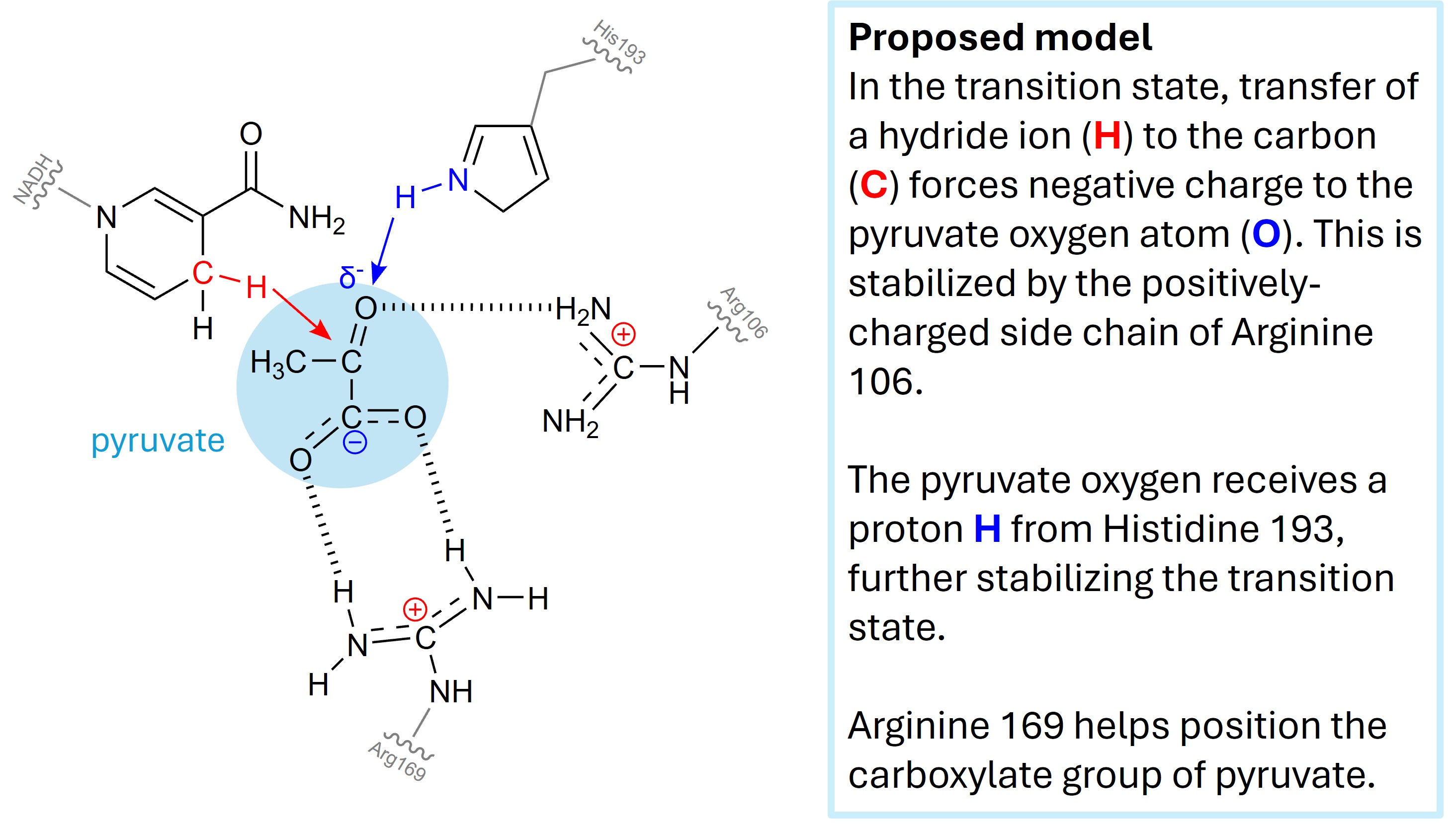 The lactate hydrogenase case study highlights how atoms belonging to the residue side chain atoms are precisely aligned to stabilize the transition state of the reaction via electrostatic interactions, proton donation, and many other interactions. Note that atoms in the enzyme backbone (specifically, the oxygen and amide N-H groups), often contribute hydrogen bonds and dipole moments to substrate binding and transition state stabilization.