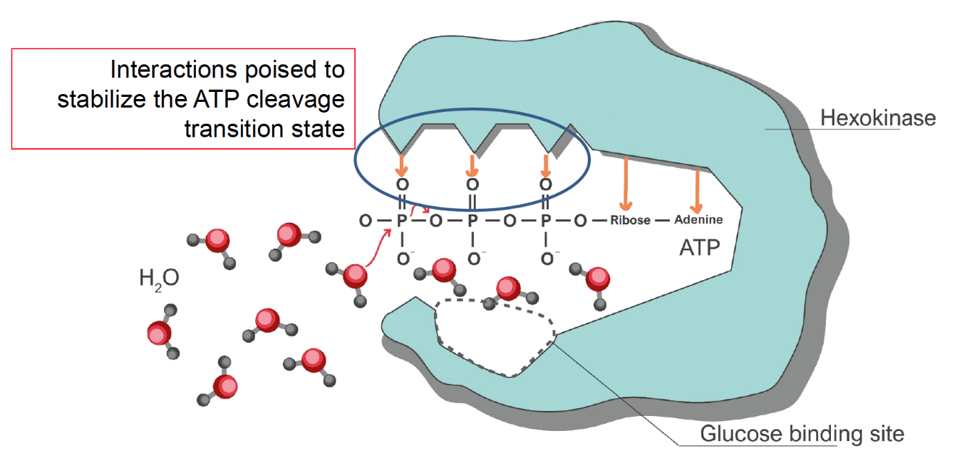 To answer this question, it is useful to think of the catalytic mechanism enacted by the active site of the hexokinase. Hexokinase (like all enzymes that catalyze phosphate transfer) stabilizes the transition state of the phosphate transfer reaction. This involves stabilizing the cleavage of the phosphate-oxygen bonds within ATP. If a poorly-designed nonselective hexokinase formed the catalytic interactions with ATP that destabilize the bonds between the phosphate groups, any acceptor molecule that also happens to be in the active site with ATP is likely to take the phosphate (Fig. 5.13). As water is so much more abundant than glucose, ATP hydrolysis would be much more likely than glucose phosphorylation. How does hexokinase prevent hydrolysis?