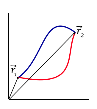 In general, the amount of work depends on the path followed. That is, the work done when going from \( \vec{r}_1 \) to \( vec{r}_2 \) over the red path in the figure below, will be different when going from \( \vec{r}_1 \) to \( \vec{r}_2 \) over the blue path. Work depends on the specific trajectory followed.