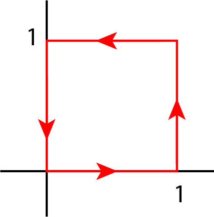 Suppose we need to calculate the integral of the vectorfield \(\vec{F}(x,y) = y \hat{x} - x \hat{y}\) over the closed curve formed by a square from \((0,0)\) to \((1,0)\), \((1,1)\), \((0,1)\) and back to \((0,0)\).