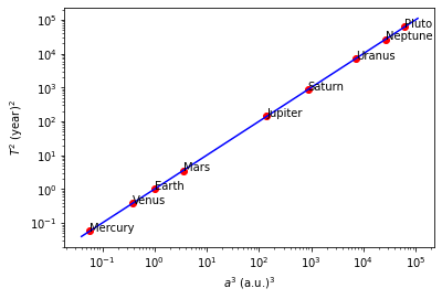 In Fig. 6.21 Kepler’s third law is shown for our solar system. The red data points are based on the measured ‘year’ of each planet and the distance to the sun. The blue line is the prediction from Newton’s theory.