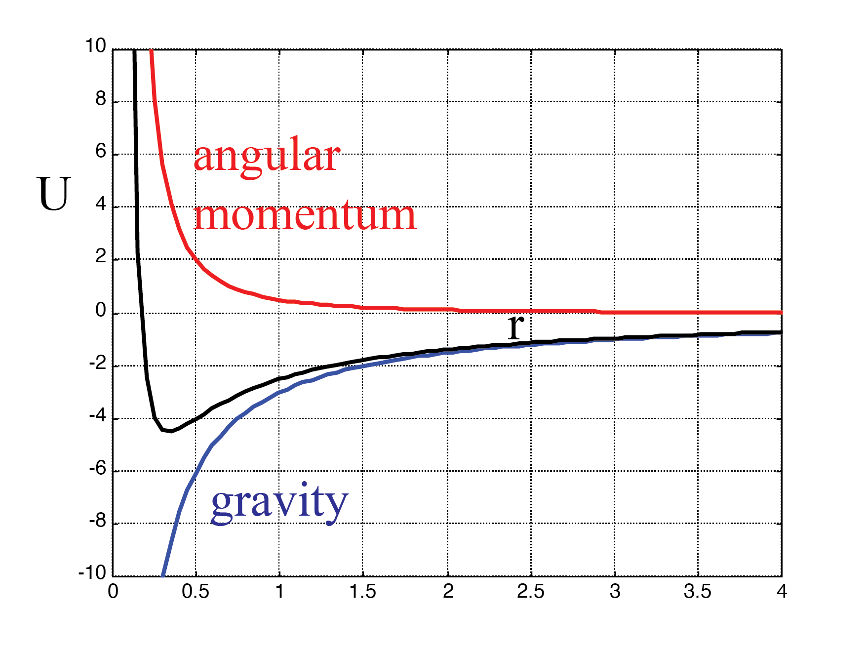 The blue line is the potential energy of gravity. The red one stems from the kinetic energy associated with the angular velocity. The black line is the sum of the two, a kind of effective potential: