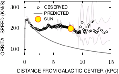 If we plot the same speed versus distance curve not for the planets in our solar system, but for stars orbiting the center of our galaxy, the milky way, then the picture looks very different. The far away stars orbit at a much higher speed than expected and the form of the found curve does not match \(\propto r^{-1/2}\).