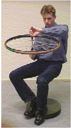 As a demo, we have a student sitting on a chair that can rotate (swivel chair). The student is holding a bicycle wheel in horizontal position.