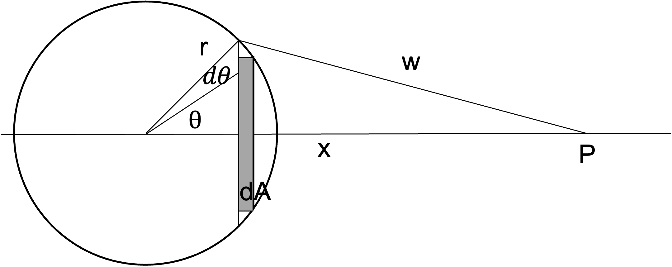 with \(m'=\sigma dA\), \(dA=2\pi r \sin\theta\, rd\theta\) the revolution of the line element around \(2\pi\). If we additionally use the relation \(w^2=x^2+r^2-2xr\cos\theta\) to allow integration over \(w\) rather than \(\theta\), the differential is \(wdw = xr \sin\theta\,d\theta\). This is very similar to what we have in the nominator above, thus
