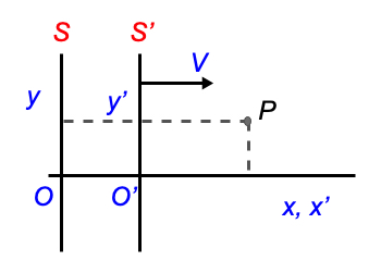 For the spatial coordinates, we see immediately: \(y=y'\). And for the \(x\)-coordinate \(S\) can do the following. To go to the \(x\)-coordinate of \(P\), first \(S\) goes to the origin \(O'\) of \(S'\). \(O'\) is a distance \(Vt\) from \(O\). Thus, the distance to \(P\) along the \(x\)-axis is \(Vt+x'\). If we sum the above up, we can formulate the relation between the coordinate system of the two observers. This transformation is known as Galilean Transformation, GT for short.