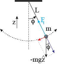 In fig:Ex91.svg a sketch is presented. We have taken the \(z-\)-coordinate pointing upwards, with \(z=0\) at the rest length of the spring beneath the ceiling.