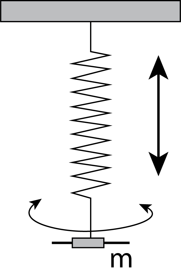 Image that we pull \(m\) a little down and let go. The spring will try to restore the position of the mass to the equilibrium position it was in prior to us pulling \(m\) down. Consequently, \(m\) will start oscillating in the vertical direction. However, something peculiar happens: the mass \(m\) also starts to rotate (around the vertical axis). And also this rotation turns out to be a back and forth oscillation. But that is not all: the two oscillations are coupled: they feed each other. If the vertical oscillation is at a maximum amplitude, the rotational motion is almost zero and vice-versa.