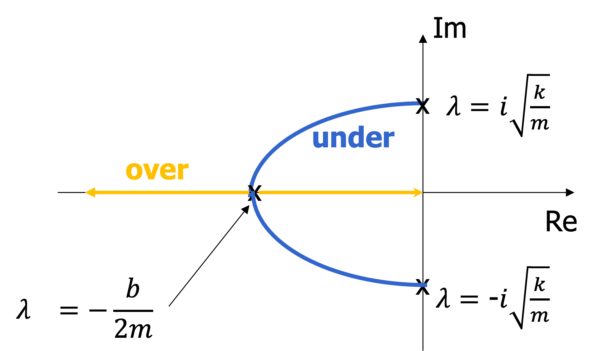 In this case, the square root in \(\lambda\) is imaginary and we can write it as \(i\sqrt{4mk - b^2}\). This gives us for the two possibilities of \(\lambda\)