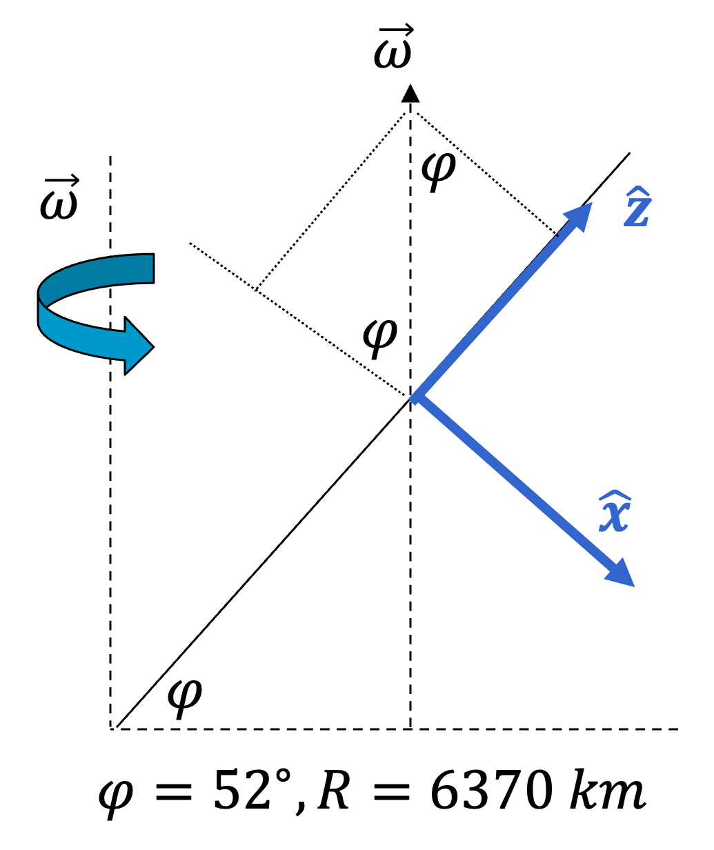 Here the angle \(\varphi\) is the latitude on the earth (Delft \(\varphi \sim 52^o\)). Now we can write down the equations of motion for the 3 components