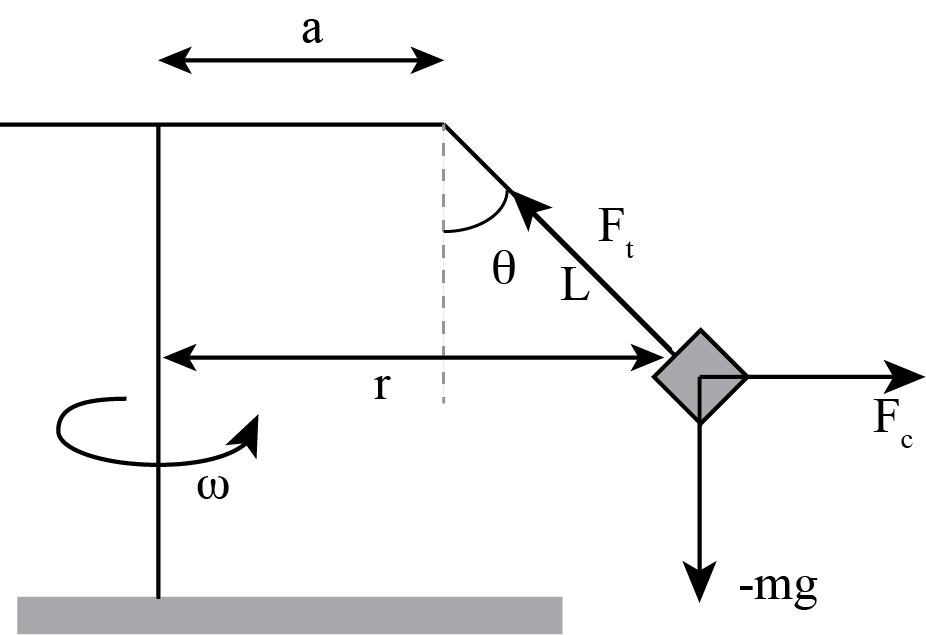 However, before buying the ticket, you want to make sure that the claim is correct. You timed the rotations and noted that it takes only 5s to complete one revolution. You estimate the arm of the merry-go-round to be \(a=4m\) and you estimate that the length of the cable to which the swings are attached is also \(L=4m\).