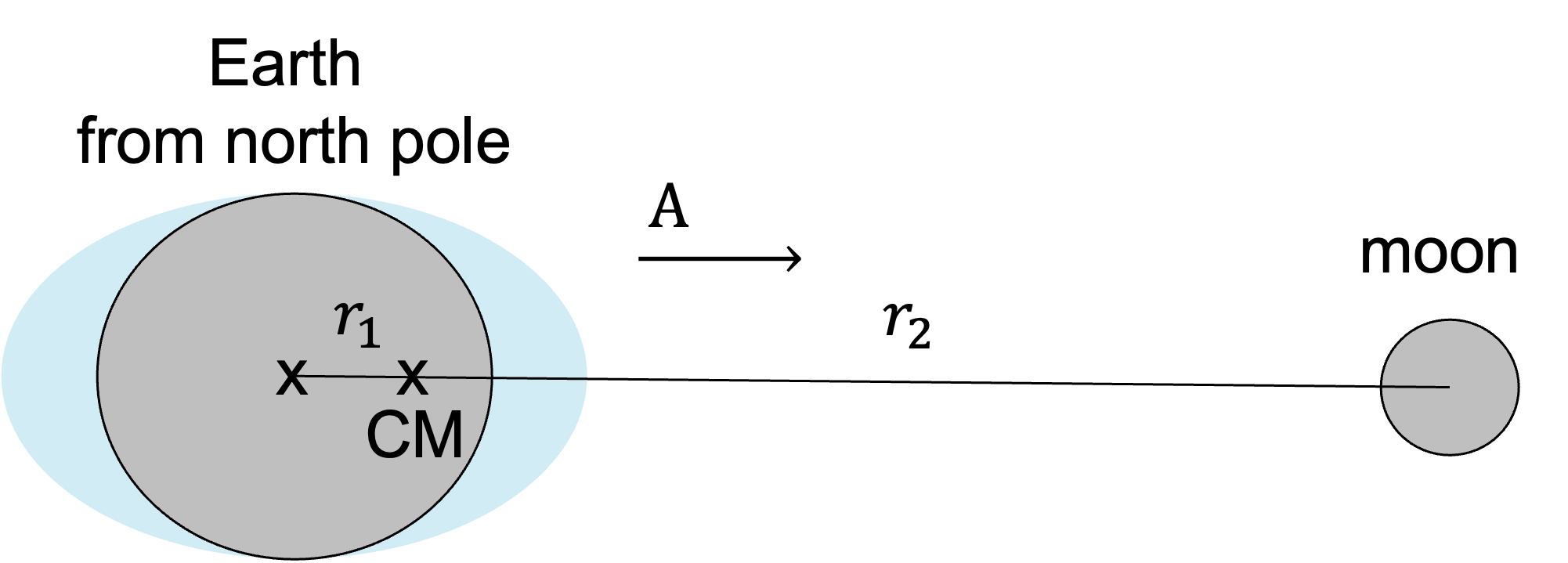 The earth and moon rotate around their common CM. The CM lies at about \(r_1=5,000\) km, inside the earth radius of \(R=6,380\) km (\(M_{earth}/M_{moon}=81\)). The common CM and rotation point is called Barycenter in astronomy. The moon accelerates the whole earth (including the water) towards the moon with gravitational pull \(\vec{A}\). That is the force an observer would feel at the earth center. On the moon facing side this force is just a bit larger, while on the far side the force is slightly smaller. Seen from the earth there is a larger force on the facing side and objects behave as if they feel an additional force that pull them towards the moon, on the far side.