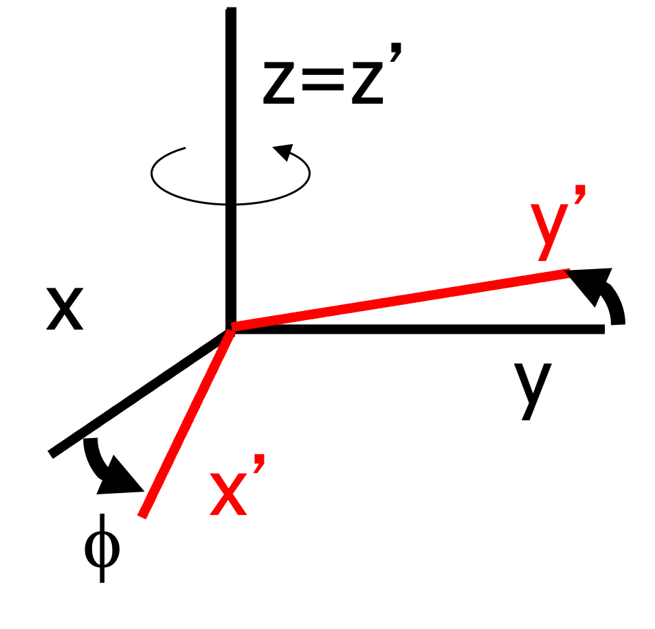 We are interested in the dynamics, so the fact that for a given \(\phi\) the two frames are rotated with respect to each other, doesn’t matter. A ‘one time’ rotation over a given angle has no consequences for velocity or acceleration.