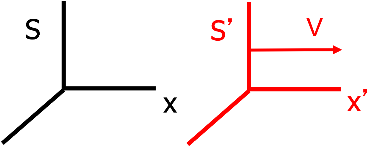 Fig. 16.2 S and S’: relative velocity parallel to the \(x\) and \(x'\) axes.#