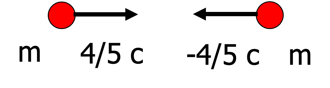 A particle of mass \(\frac{3}{5}m\) is moving at velocity \(v_1/c = 4/5\) over the \(x-axis\). From the other side a particle with mass \(\frac{4}{5}m\) is approaching with velocity \(v_2/c = 3/5\). The two particles will collide. After the collision, they maintained each their original mass. The collision is perfectly elastic.