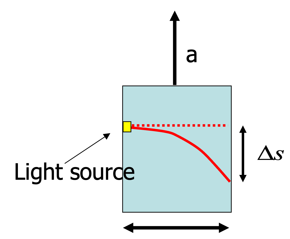 If you consider a light source in an elevator that is accelerated with \(a\), then it feels normal that the light bends downwards over a distance \(L\) as \(\Delta s = \frac{1}{2}a\Delta t^2 \approx \frac{1}{2}a\left ( \frac{L}{c}\right )^2\). But as this is the same for an observer at rest with a constant gravitational field with \(g=a\), we note that gravity acts on massless particles! If you fill in numbers, you see that the effect is (very) small as long as \(L\) is not very large \((L/\Delta t \sim c)\).