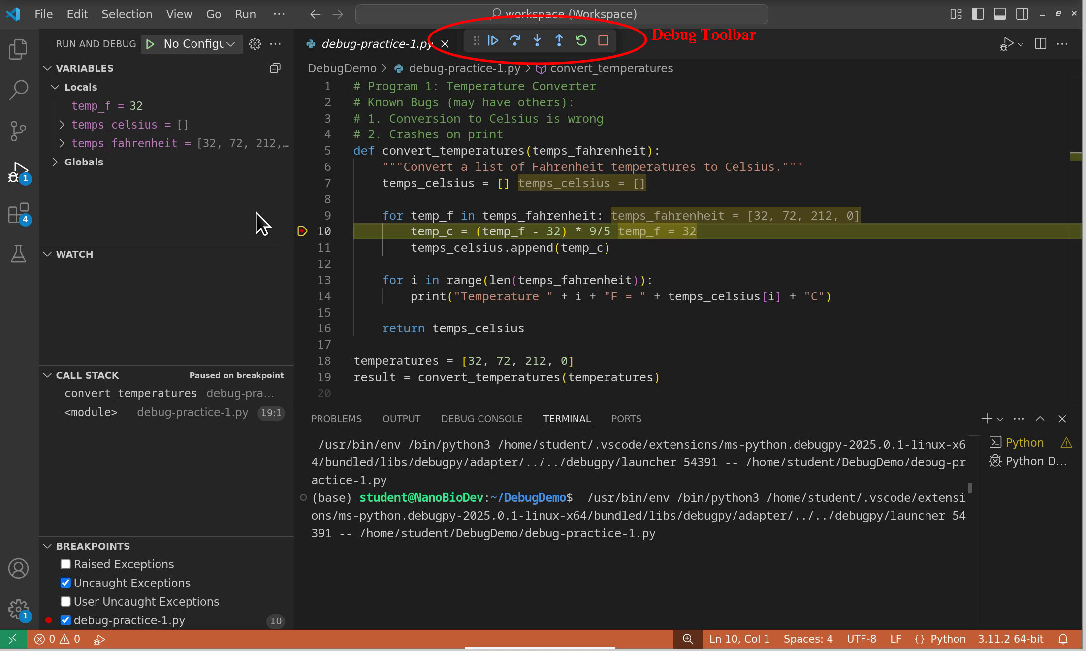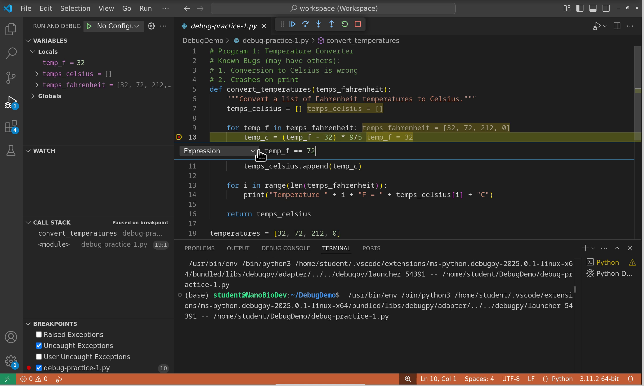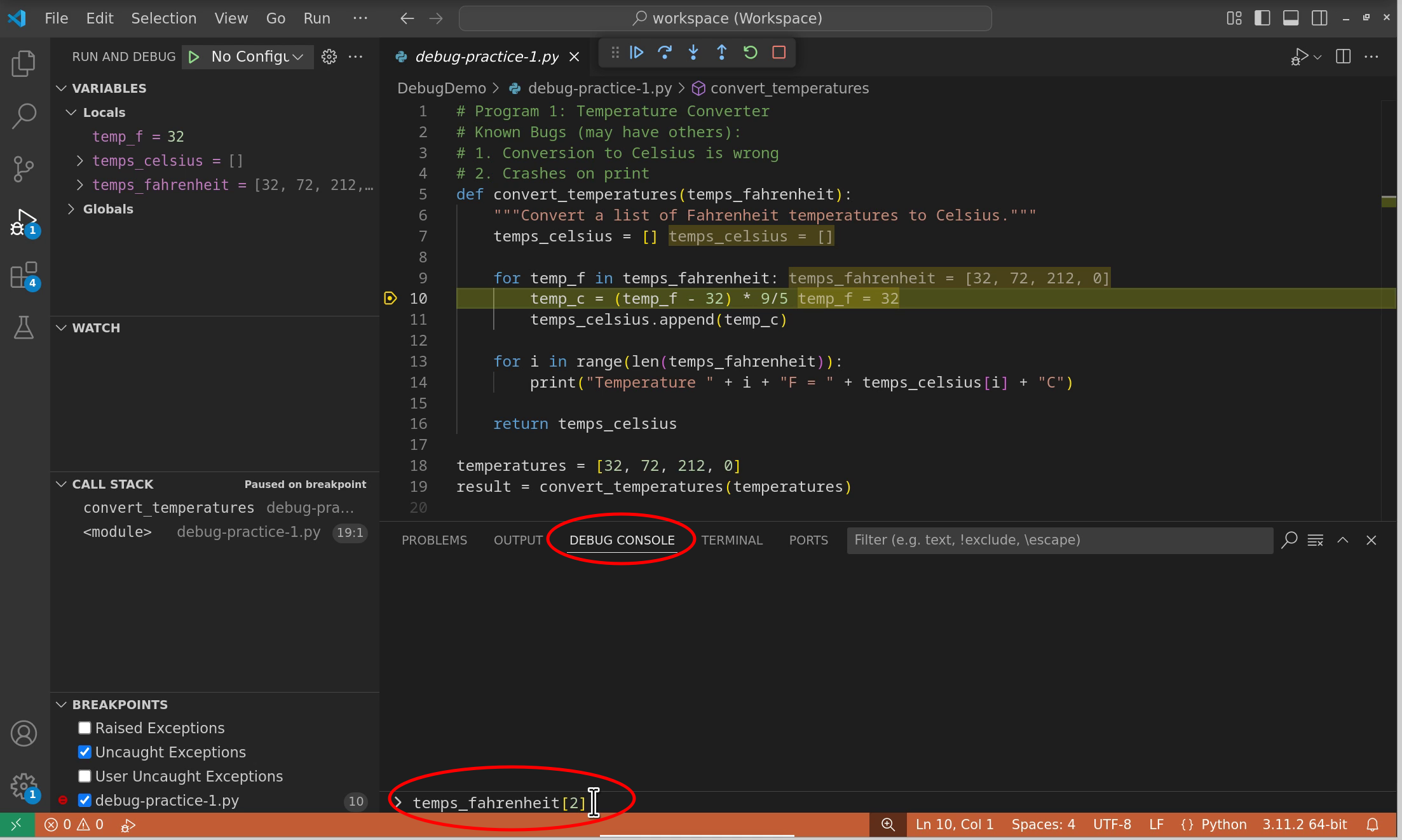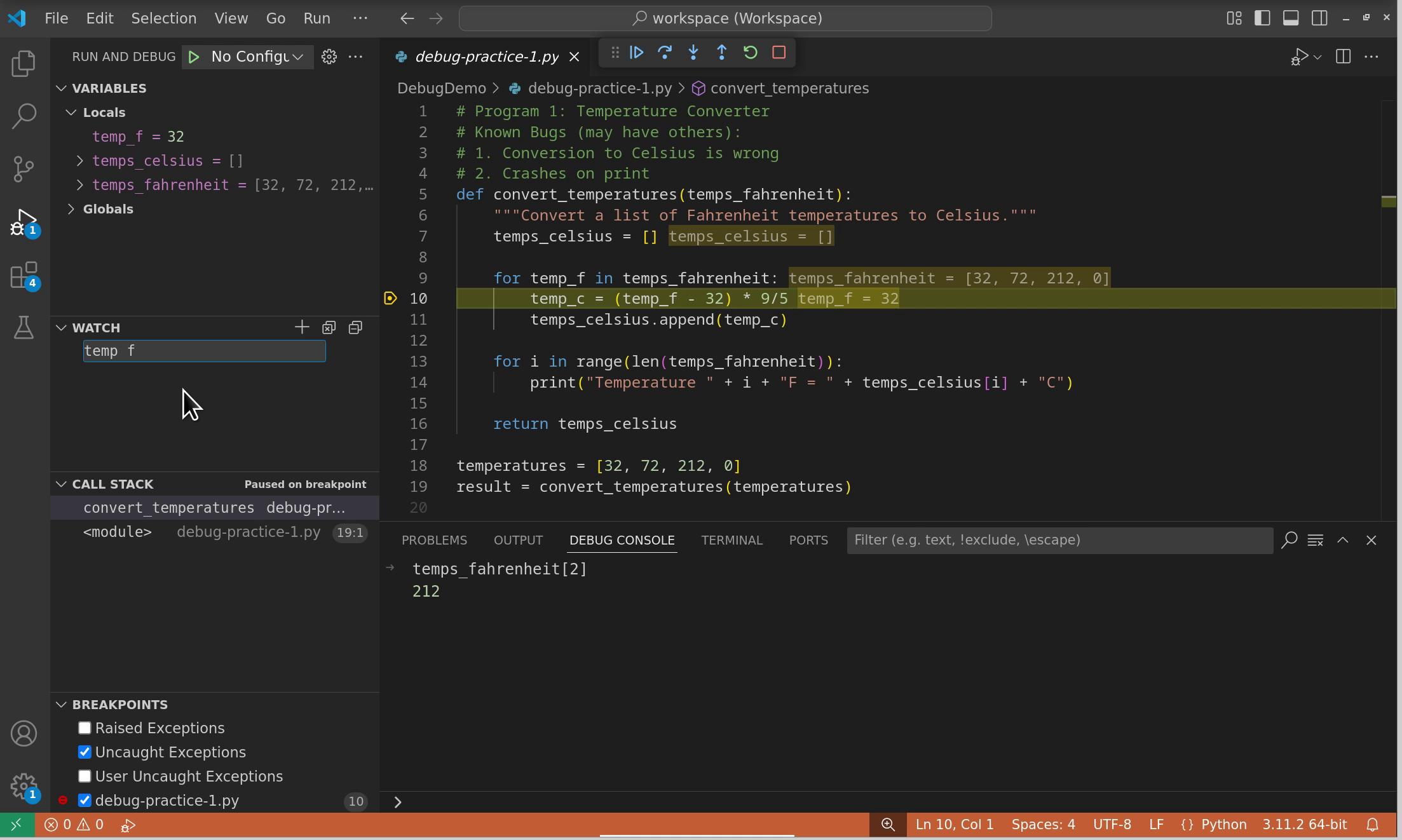 temp > 100. Run the debugger and verify it only stops for temperatures above 100°F.Watch expressions: Add these watch expressions: