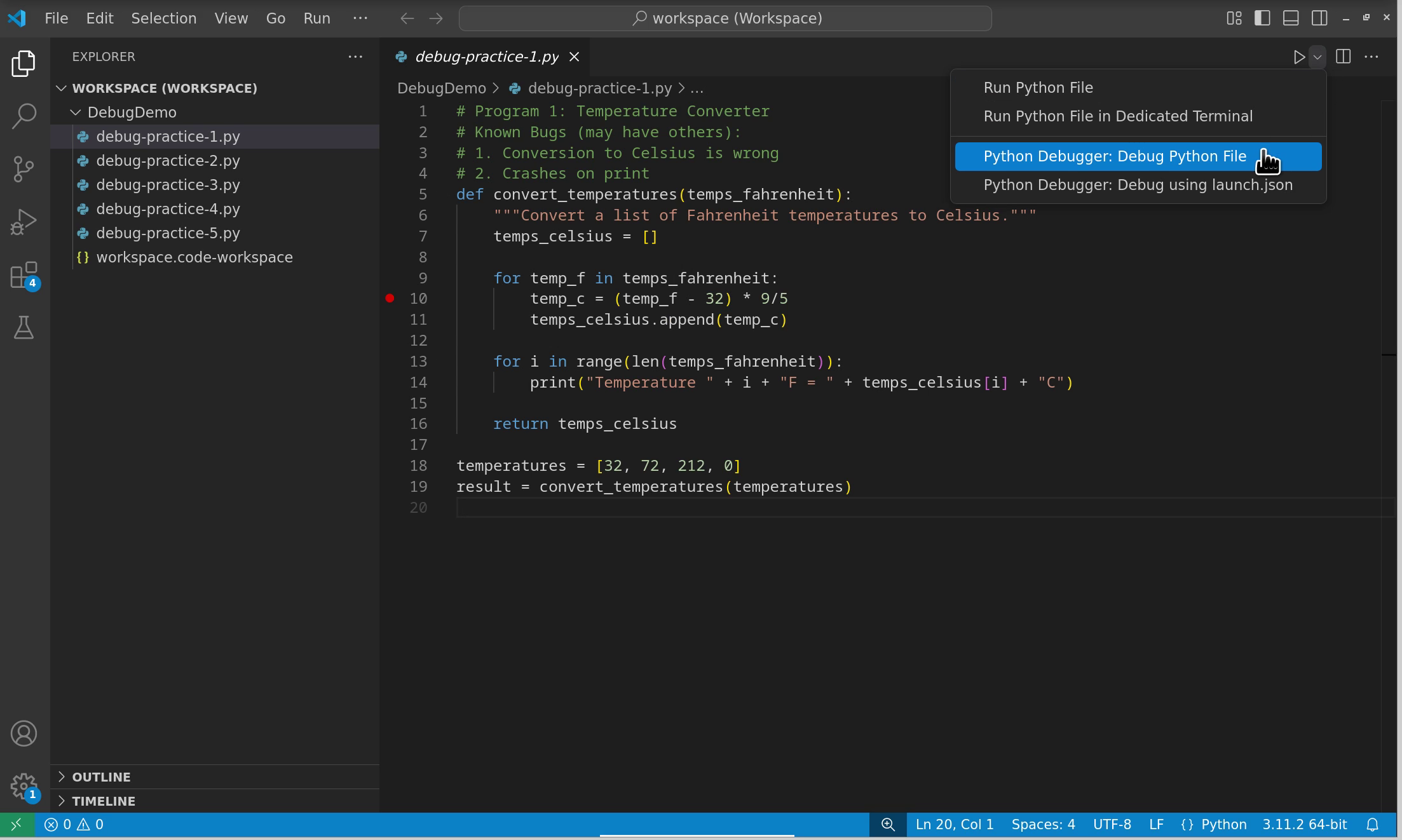 To initiate debugging in VS Code, you have several options. Click on the down arrow next to the run button and select “Python Debugger: Debug Python File”.