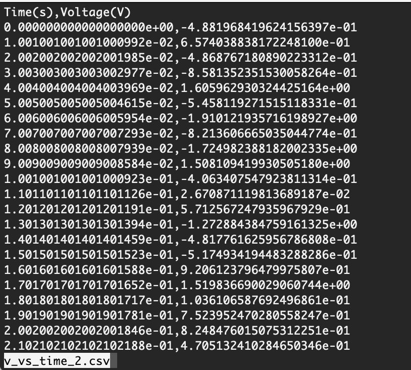 Here we loaded the data from the v_vs_time.dat file and printed it. While not obvious from the data itself, the file name suggests what this data is about: measurements of voltage as a function of time. In this case, the data is recorded in two columns of numbers in a text file, where numbers in two columns are separated by a space. The first number is the time of the measurement (in seconds) and the second is the measured voltage (in volts).