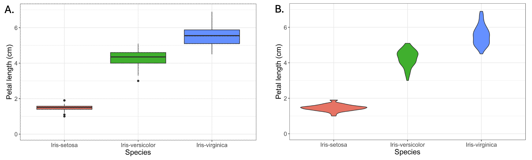 Fig. 12.8 Boxplot (panel A) and violinplot (panel B) showing the distribution of petal lengths for three iris species, the same distribution that was earlier shown as a histogram.#