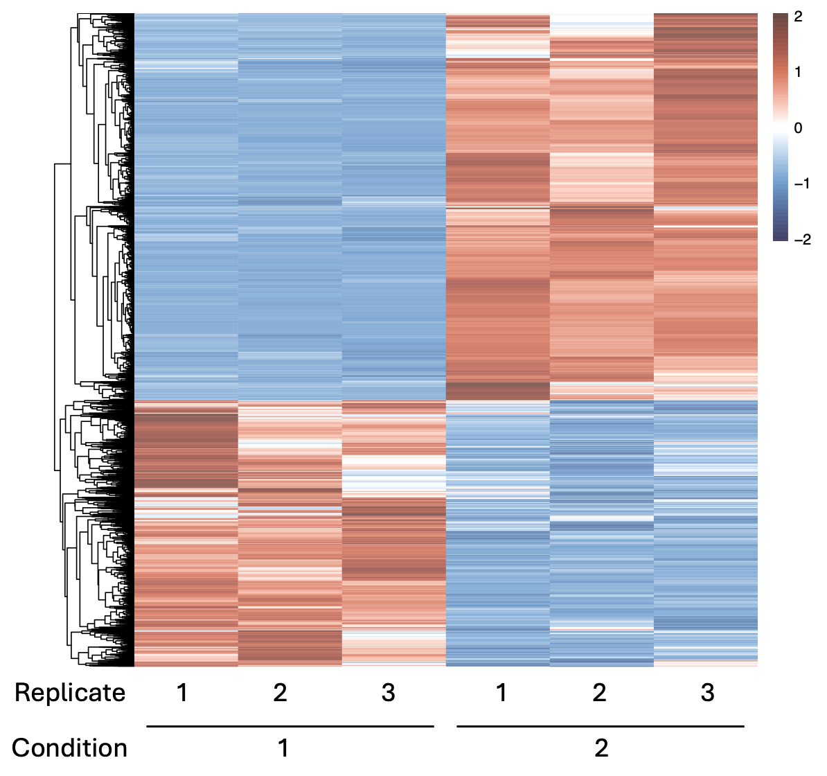 Fig. 12.10 Heatmap showing differential expression (transcriptomics data) for three replicates in two different conditions. We can see that there are two clear groups: RNAs (y-axis) that in all replicates get down-regulated (blue) in condition 1 and up-regulated (red) in condition 2, and the other way around.#