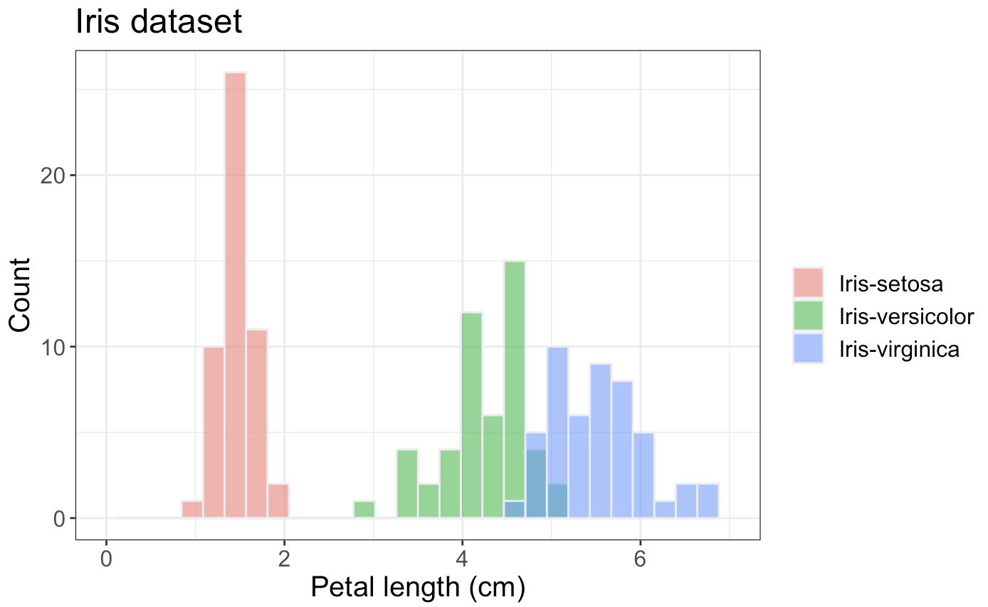Fig. 12.7 Histogram showing the distribution of petal lengths for three iris species.#