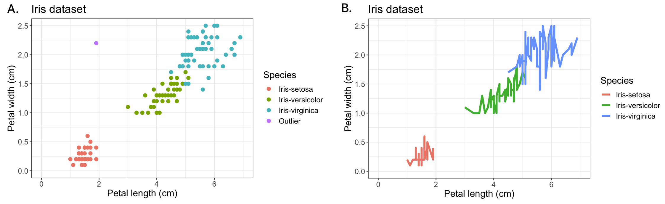 Fig. 12.4 Iris dataset with four measurements for three species of iris (we’ve encountered this dataset earlier). Panel A. The scatter plot suggests that there is a correlation between petal width and length, i.e., as one becomes larger, the other one does too. We can clearly see the distribution of the data, where petal length varies between 0 and 7 cm, and petal width is between 0 and 2.5 cm. There appear to be clusters in the data, e.g., Iris setosa has both smaller petal length and petal width than the other two species. We also introduced an artificial outlier - this is data point that clearly stands out from the rest of the data. In reality, an outlier would be “hidden” among the iris data. Panel B. The same data (but without outlier) plotted as a line plot. The line plot type clearly doesn’t make sense for this data.#