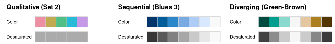 Qualitative: contrasting colors are useful for categorical information. Every color has the same perceived weight.