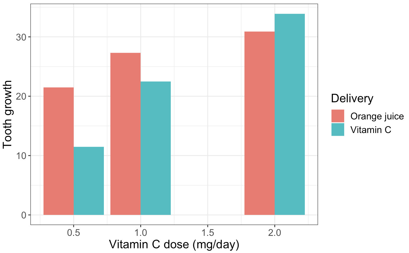 Fig. 12.6 Bar plot highlighting differences in tooth growth between two groups (“Vitamin C” and “Orange juice”) under different doses. Data is based on ToothGrowth dataset.#