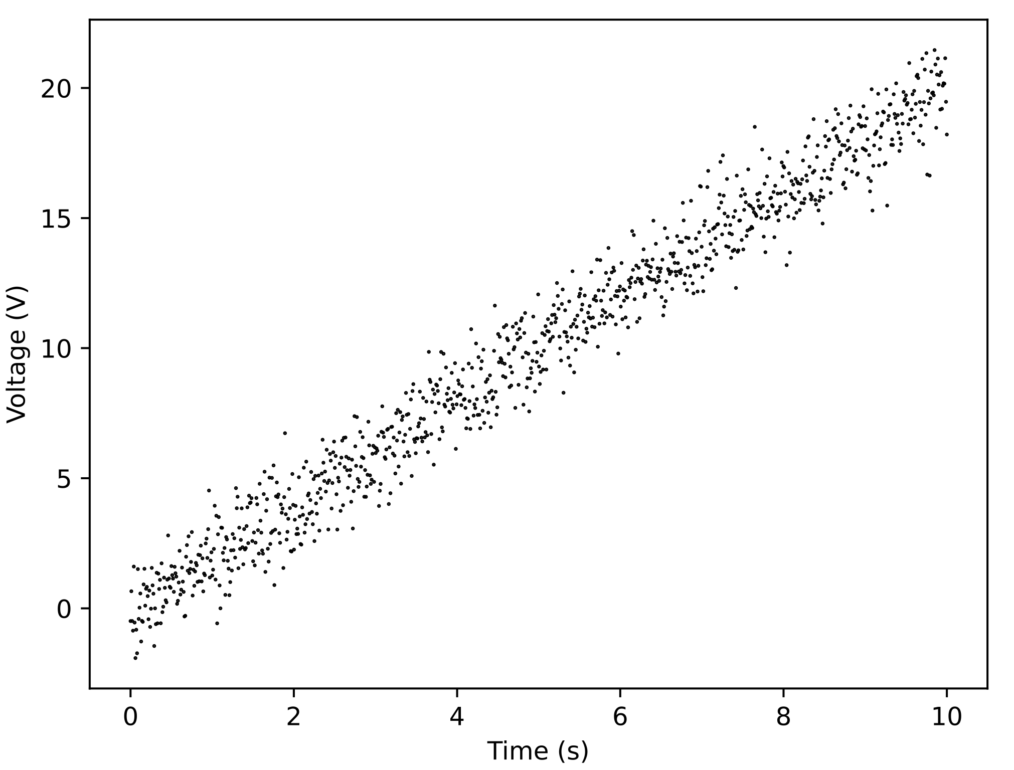 As you may note, our red line didn’t pass exactly through all the points in the time-voltage plot. In practice, there often does not exist a single line that goes exactly through all the data points. This raises the question: what straight line fits “best” through data points?