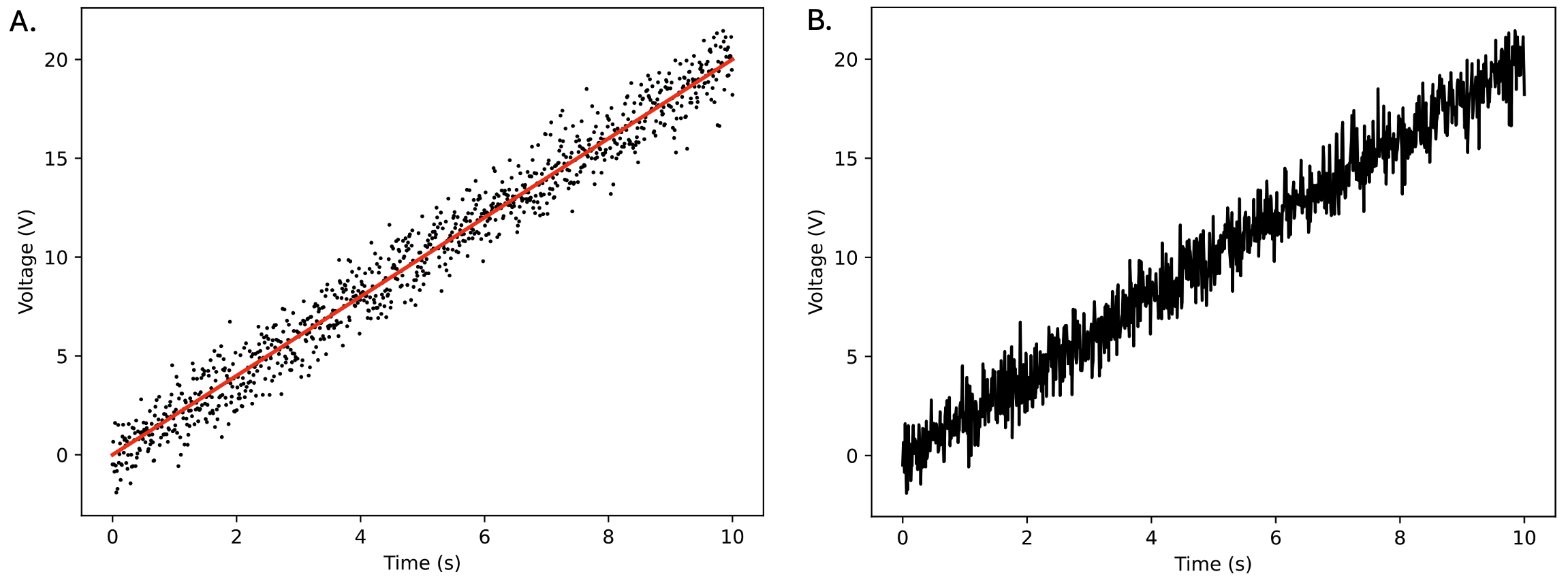 Fig. 12.5 Time-voltage dataset. Panel A. Data points are shown as dots. We can see that voltage increases roughly as \(2 \times time\), so we plot the underlying trend as a red line. Panel B. Data points connected by the line (i.e., a line plot instead of a scatter plot). Note how this makes it much more difficult to see what the actual measurements were.#