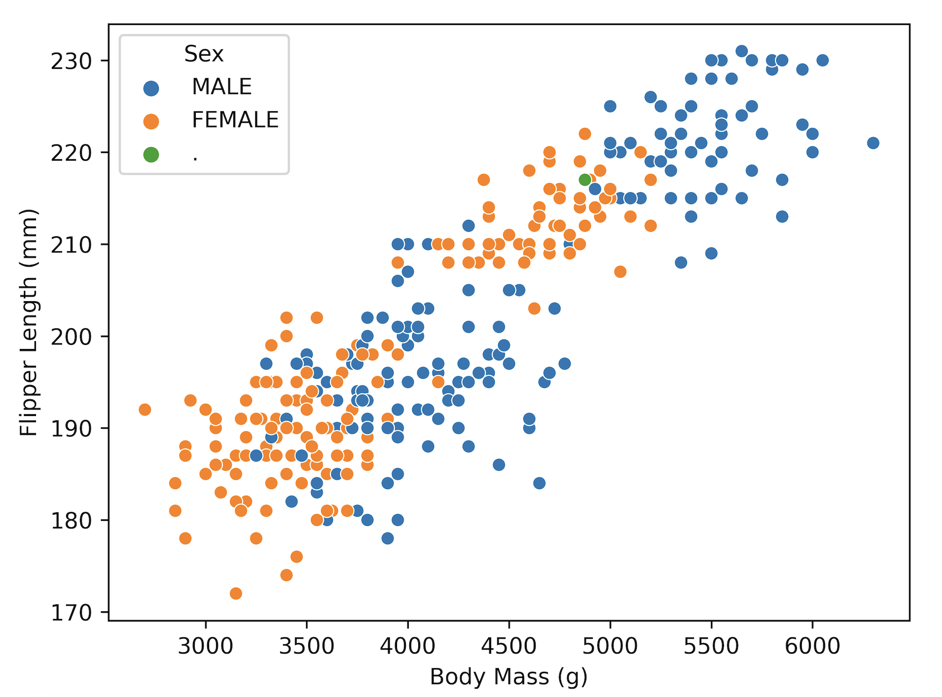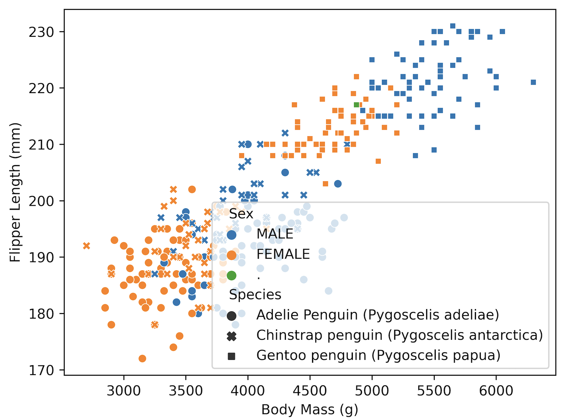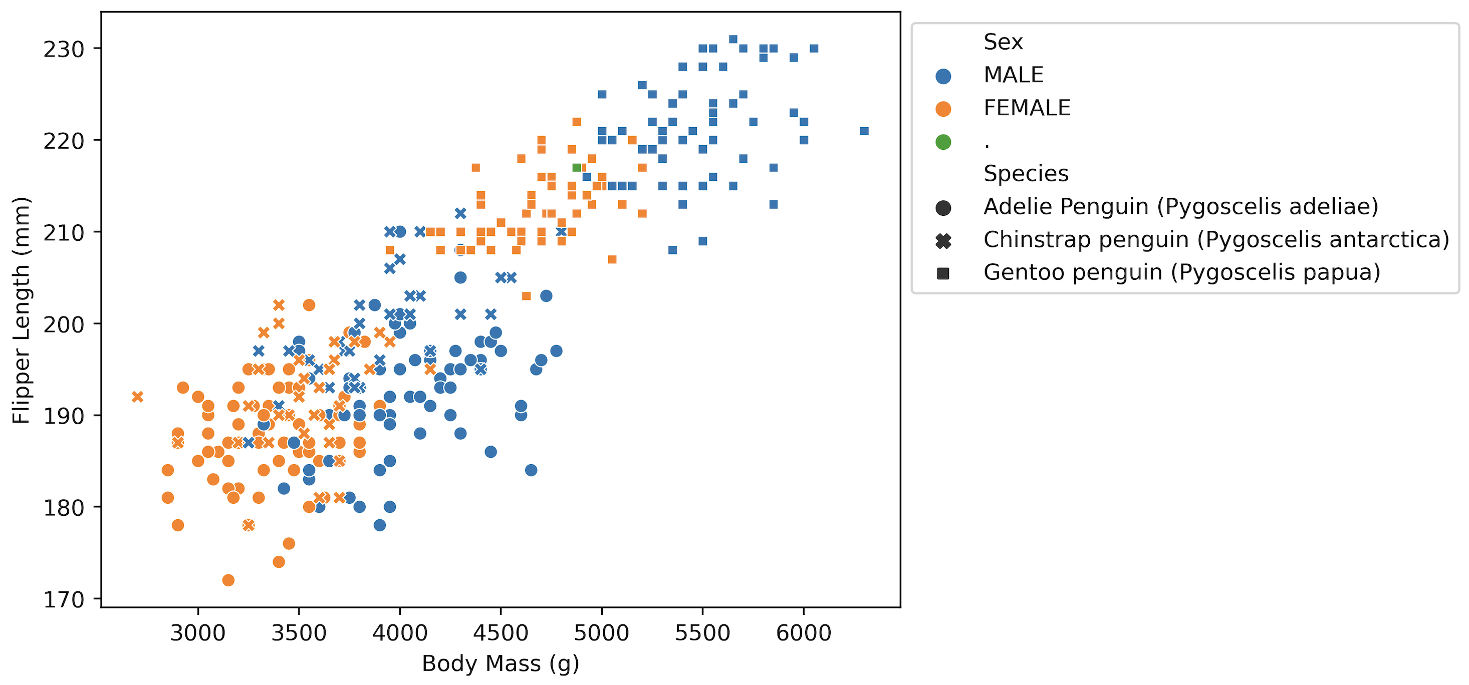 If you wanted to make a more fine-grained distinction in your plot, e.g., color data points by values in another column, that’s also possible. Let’s say you’re interested which data points in the Body mass (g) vs. Flipper length (mm) plot belong to male or female penguins. You can use hue for that - seaborn will then give different colors base on the values in the column Sex. Conveniently, it also creates a legend for you and tries to find an optimal position for it.