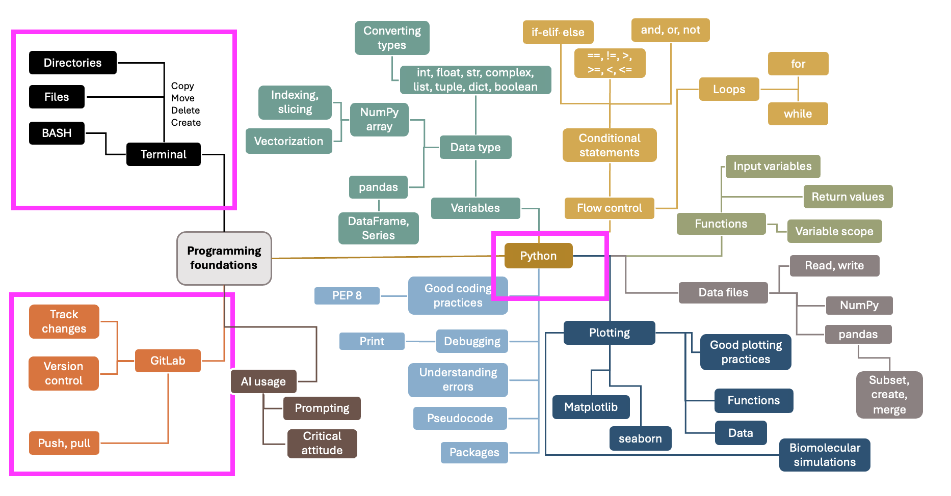 For programming in Python and working with data in nanobiology, we need several essential tools: a code editor for writing scripts, a version control system for tracking changes, a Python interpreter for running code, and a terminal for system interaction and automation. Each of these components serves a specific purpose, but they must be properly installed and configured to work together.