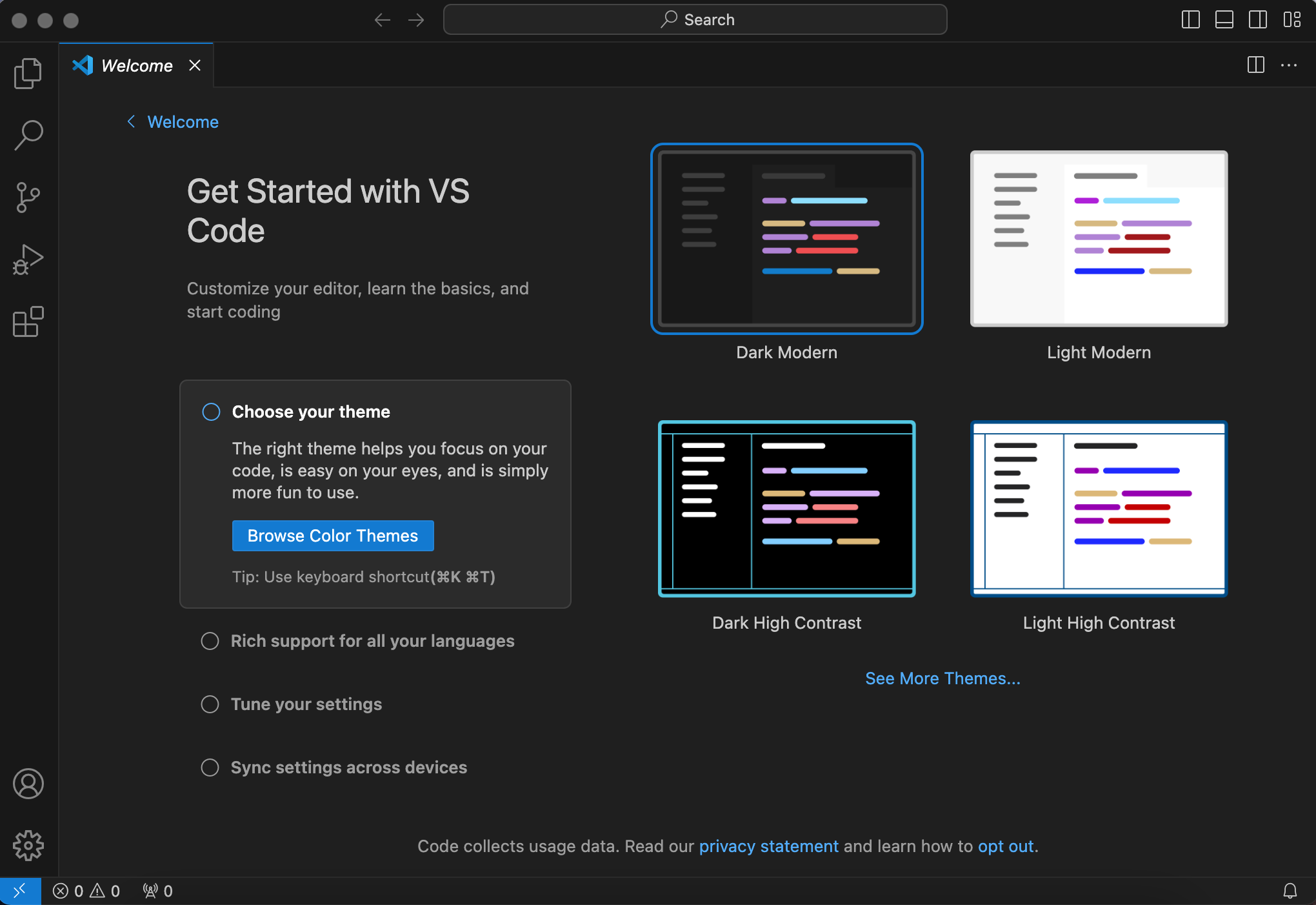 VS Code application: double-click on it to open it. If you’re asked whether you’re sure if you want to open this app, press “Open”. VS Code should then open and you should see the screen such as this: