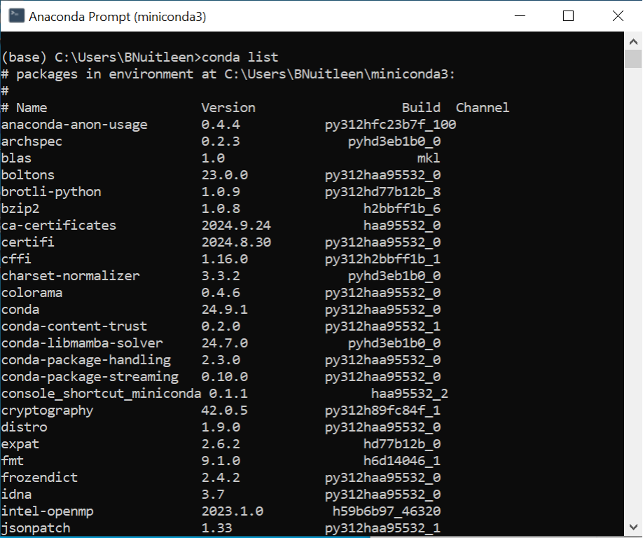 conda listand pressEnter. If your Miniconda installation was successful, you will get output like this (you can also scroll up to see the entire list of installed packages):