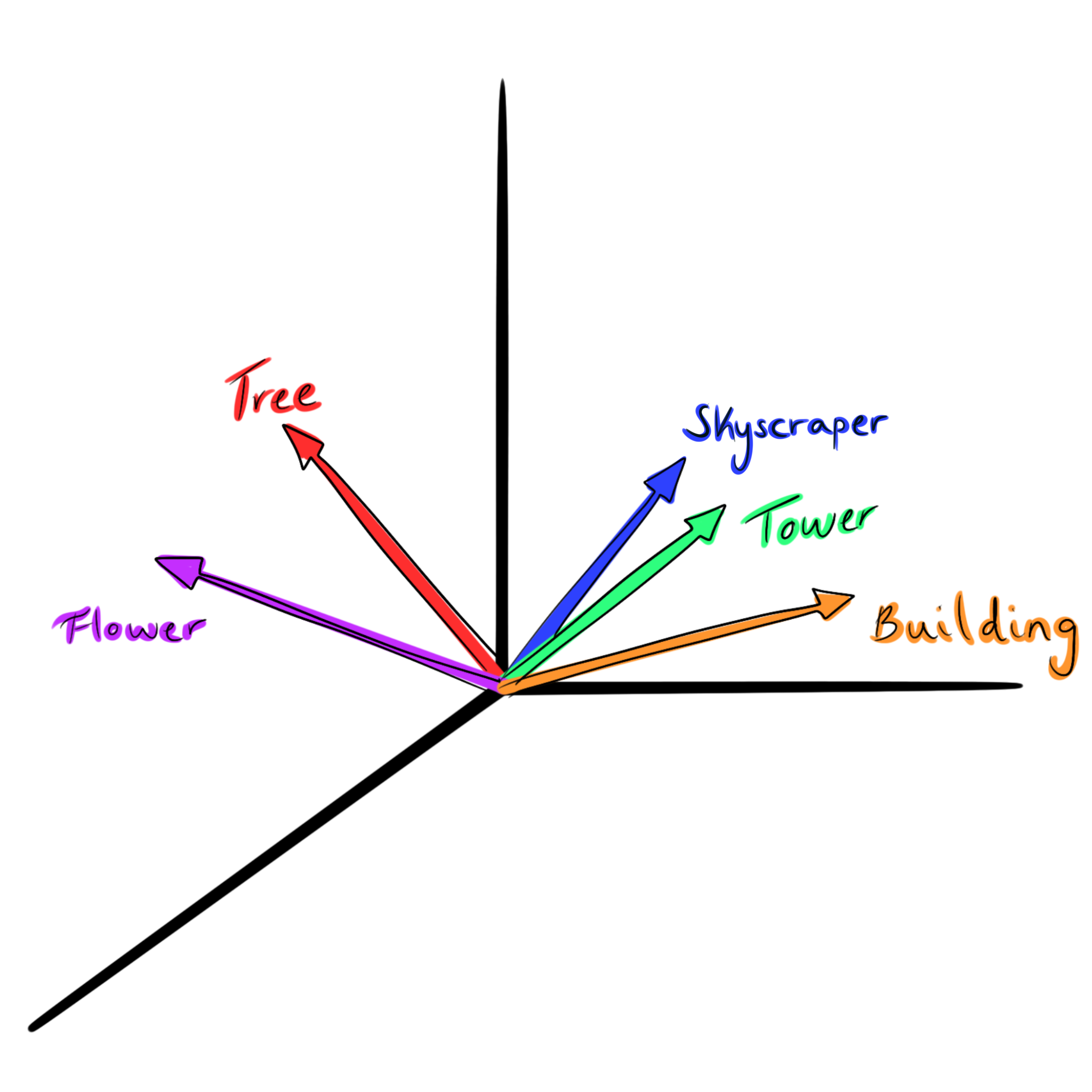 Fig. 6.2 Simple representation showing a few word vectors, where “building”, “tower”, and “skyscraper” are separate from “flower” and “tree”.#