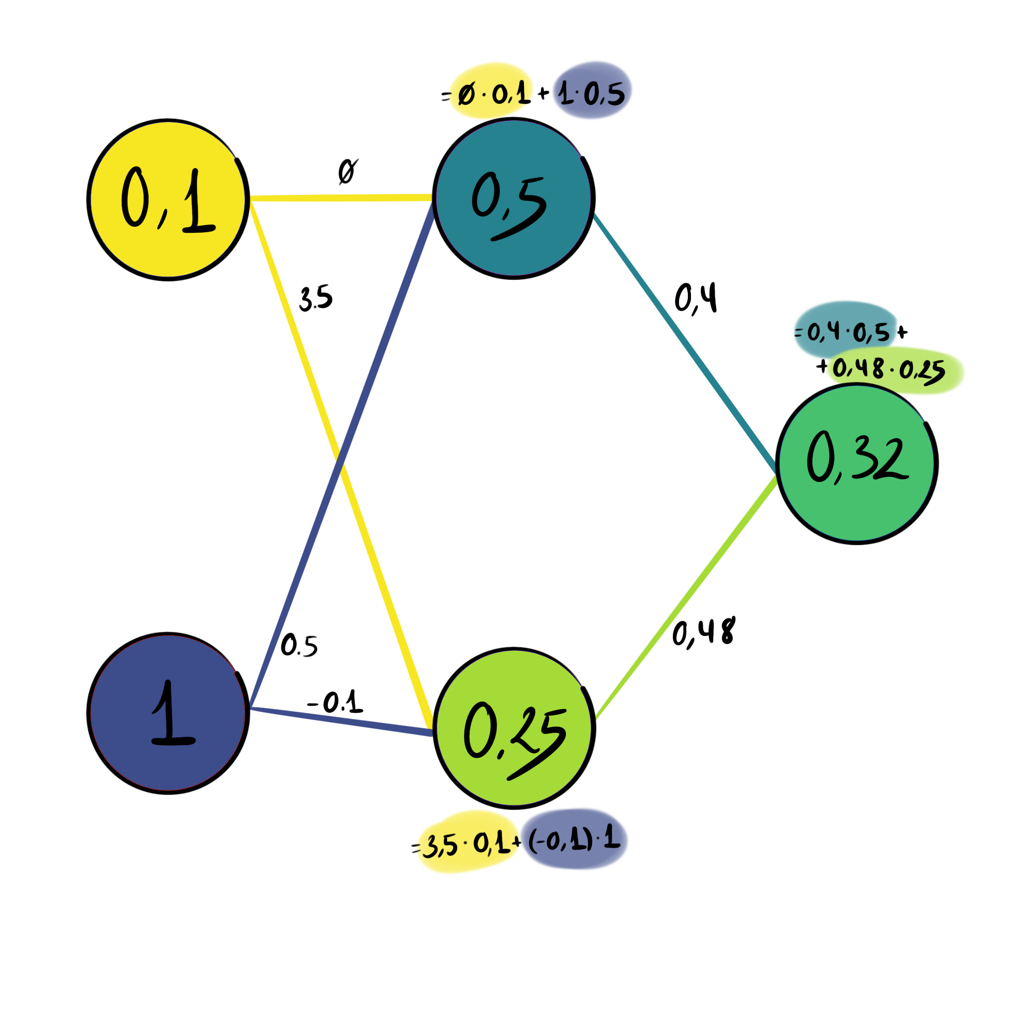 This altering of the input is achieved through the connections between neurons, which affect the state or value of the neuron. Each connection between neurons has a certain weight. This weight will determine how much the neuron in the first layer affects the neuron in the second layer. Mathematically this means that the value of a neuron in the hidden or output layer is just the sum of all values in the previous layer, multiplied by their individual weights. In addition, each neuron has a bias, which offsets its value independently from the previous neurons.
