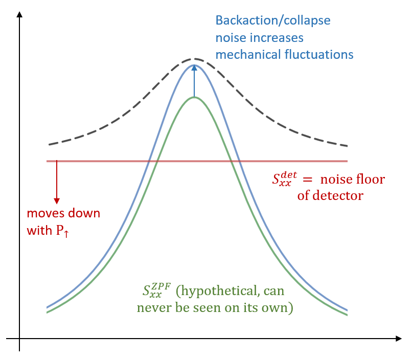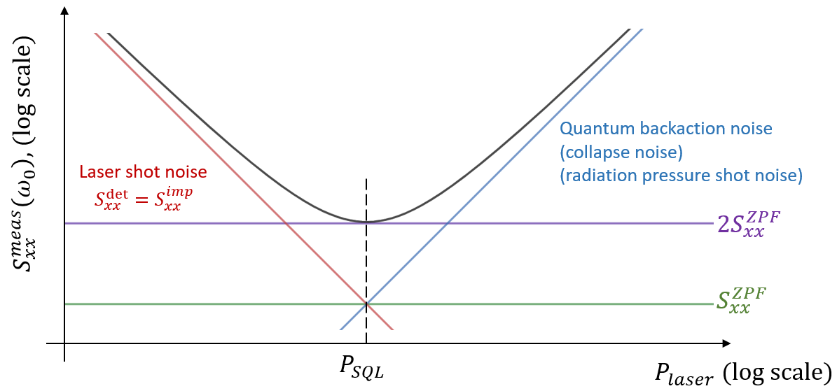 As we know, we can always increase the position sensitivity of a laser interferometer by turning up the laser power (in principle, though, in real life the laser power can be limited by boring things like absorption heating and melting mirrors). But ignoring these issues, we can theoretically just turn up the laser, decreasing the (squared) sensitivity of the laser detector because \(S_{xx}^{det} \propto \frac{1}{P}\) until it is smaller than \(S_{xx}^{ZPF}\) and then directly observe quantum fluctuations.